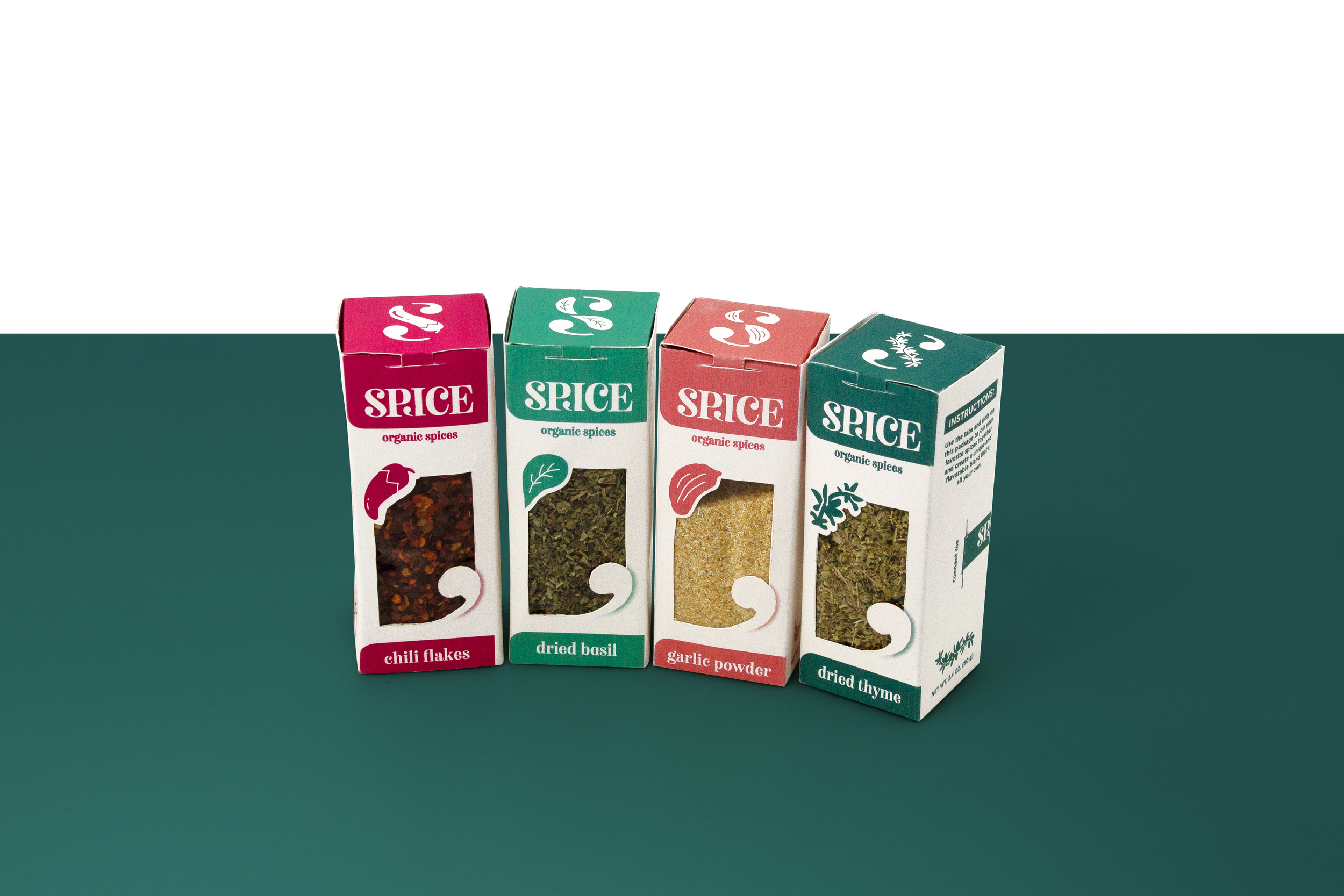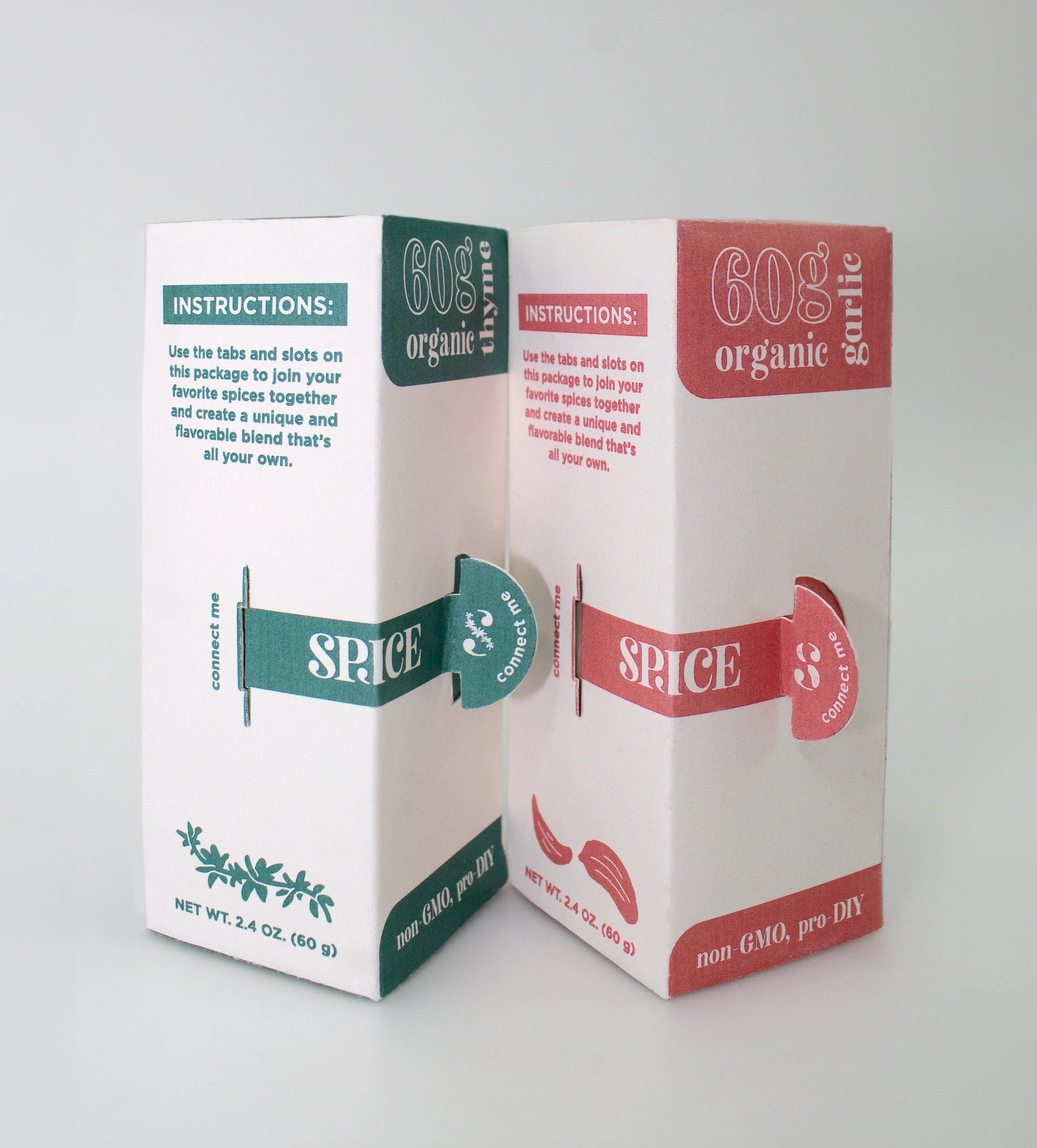 Connect spices with the tabs and slots on the side of the packaging to create your own unique spice blends and store them as such. The dispensing holes are perforated, introducing another layer of customization and allowing you to choose how much product you want to dispense